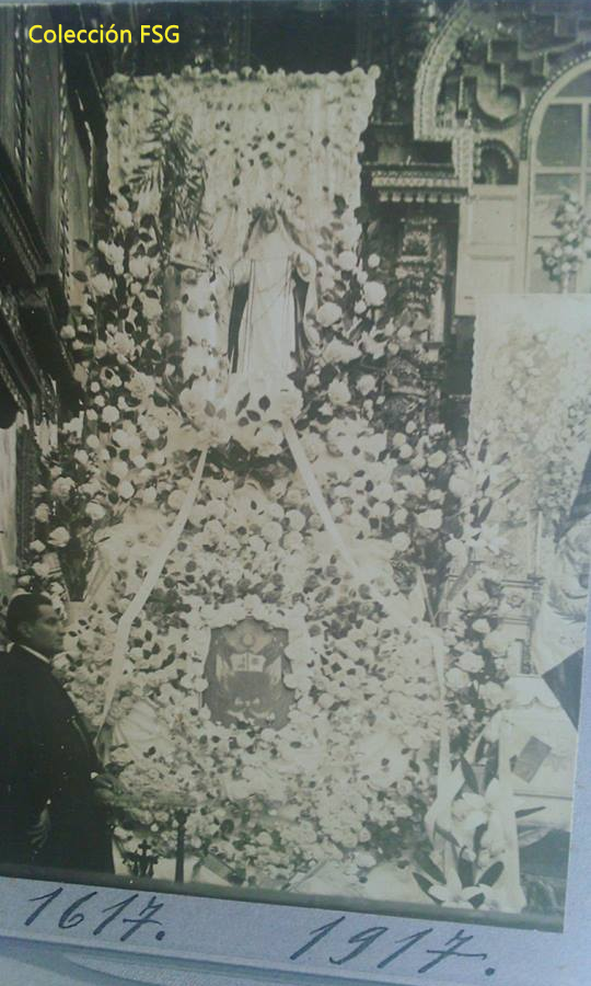 El Párroco Emilio Ramírez junto a un arreglo floral para la Procesión de Santa Rosa en el año 1917. Huancavelica