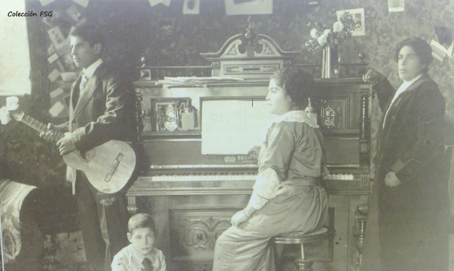 A la derecha de pie: Berenice Merino viuda de Moyano; sentada al piano: Luz Moyano Merino A la izquierda parado con guitarra: Basilio Moyano Merino, sentado en el suelo: Alfonso Cárdenas Merino. Doña Berenice fue hija de don Pedro Merino y de doña Margarita Lozano: Basilio murió joven, Luz en sus años productivos fue la única mujer contratista en la construcción del Tren Macho Y Alfonso Cárdenas es un personaje importante en la historia de Huancavelica al que me referiré oportunamente.