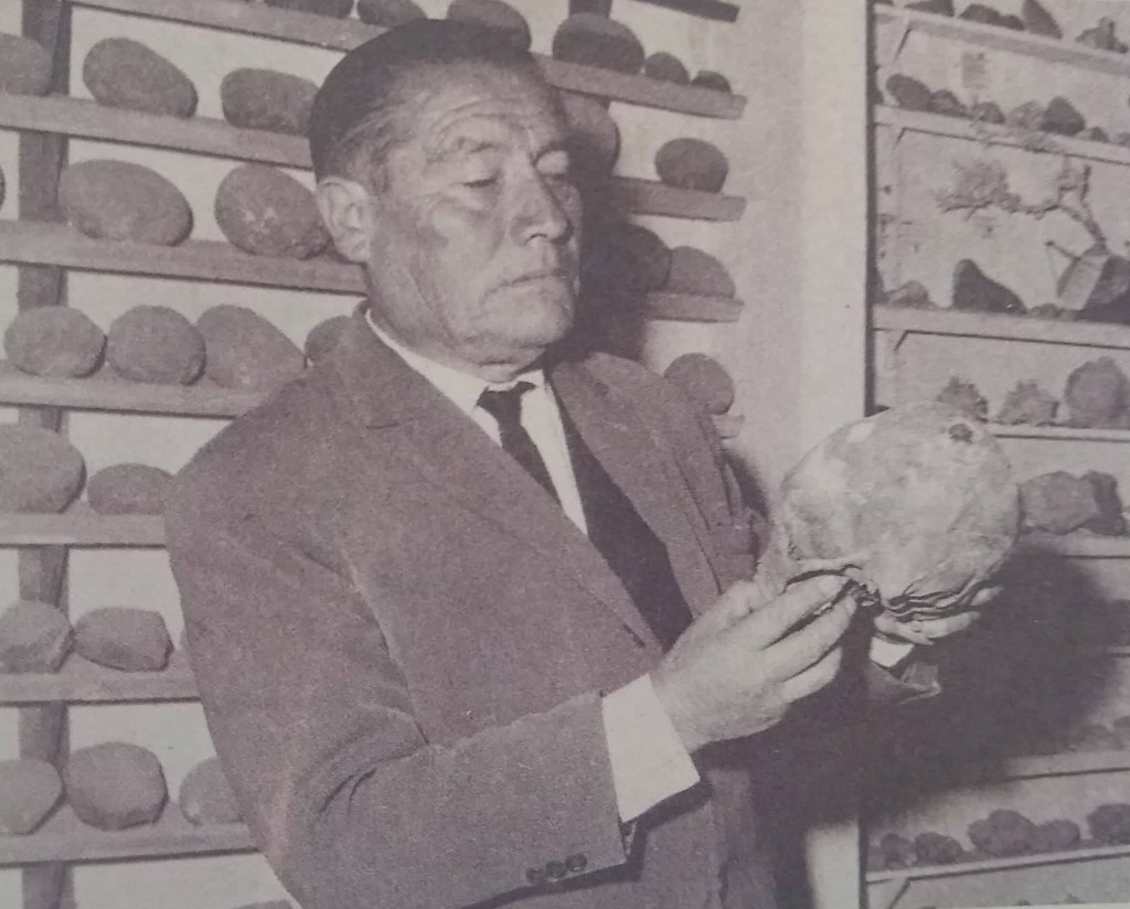 El investigador Julio C. Ruiz Pimentel sostiene un cráneo de doble trepanación en su mueso particular de Huancavelica. Este museo funcionaba en la calle 2 de Mayo 479 y reunía restos de las épocas pre incas e incaica. También tenia exhibiendo piezas de la independencia como: corazas, cofres, cuadros así como copia del acta de la independencia y de la capitulación de Ayacucho.