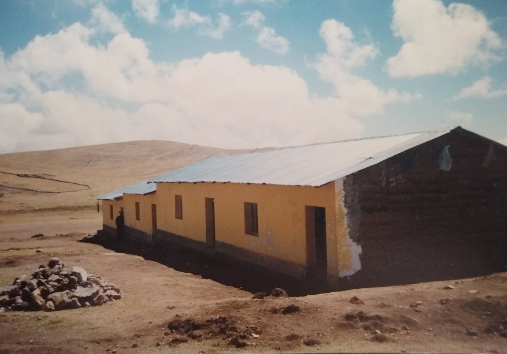 En 1996 la municipalidad provincial de Huancavelica no contaba con recursos económicos para atender las necesidades de sus Distritos y mucho menos de sus centros poblados, no existían aulas pedagógicas ni tampoco postas medicas y en el 80 % de los casos tampoco trochas carrozables de acceso. La construcción de la foto fue desarrollada con el esfuerzo comunitario del centro poblado CUNYACC – PACHACCLLA, en donde sus miembros levantaron paredes y techo sin cobrar un solo centavo y con la idea de proveer educación a su hijos ya que el Estado Peruano estaba totalmente ausente para todos los efectos.
