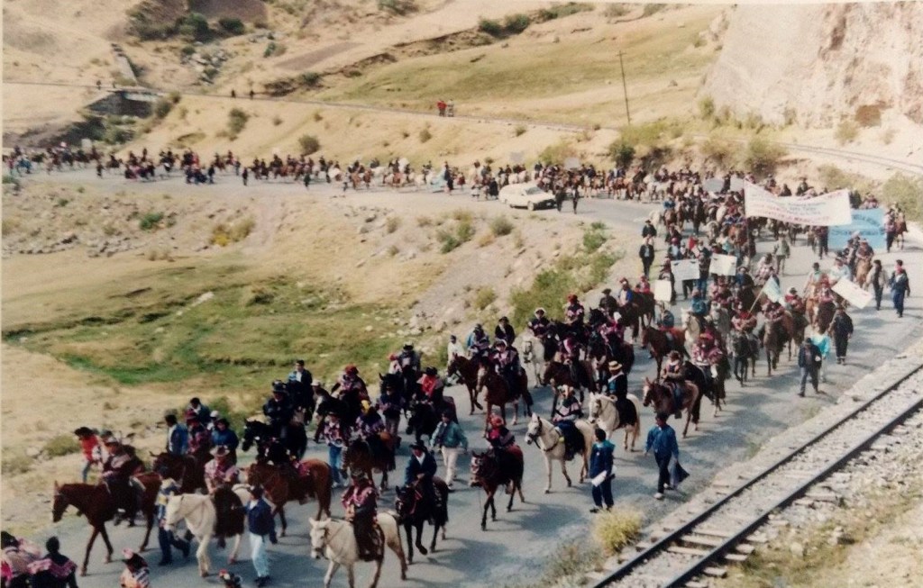 Había un silencio a nuestro paso, observen en la foto que no había multitudes en la calle recibiéndome con mis hermanos campesinos. Entrábamos en silencio, sin querer asustar a nadie, tan solo mostrando la fortaleza de nuestro movimiento. Es que en aquellos tiempos la herida y temor a los grupos terroristas estaba aún vigente y había miedo, mucho miedo. Para la gran mayoría de gente del campo, nunca conocieron a sus autoridades, ni siquiera en campaña, En sus pueblos no había carreteras, no habían aulas escolares, no había postas médicas, no había luz, mucho menos agua o desagüe.